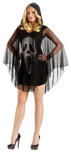Poncho Ghost Face Costume includes black hooded sleeveless mini dress with screen printed ghost face and attached sheer mesh poncho. Please note this Halloween Costume does not include shoes. This Scary Costume is available in adult sizes Small/Medium (2-8) and Medium/Large (10-14). This Screamer Ghost Face Costume is an officially licensed Ghost Face Costume (TM). Care instructions: Hand wash cold, line dry flat. Do not iron.| Brand: | |