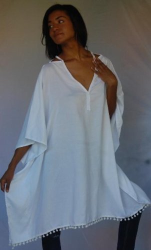 A top that's feminine and flirtatious, completely comfortable and carefree and simply a delight to wear.The top has a deep v-neckline with "peek-a-boo" openings at the shoulder, arm openings in the side seams and a very loose, wide cut. Length is just above the knee and the cutest pom-poms circle the hem all way round.Made up in Lotustraders' trademark smooth rayon fabric, a sensuously silky and soft delight to wear. The drape and flow is extraordinary.A lovely summertime top that's cool and carefree, this looks great with jeans or capris. The ideal swim-suit cover-up too!| Brand: | |