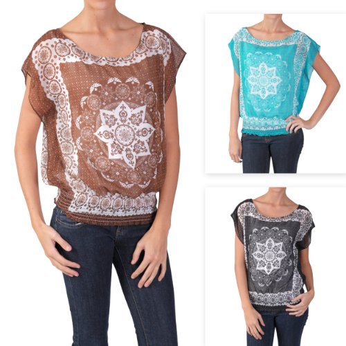 This fashionable handkerchief print top by Hailey Jeans Co features a wide boat neckline. A smocked bottom hemline and sleeveless design also adds style to this relaxed-fit top. Constructed of lightweight material, this woven top is slightly sheer.| Brand: | |