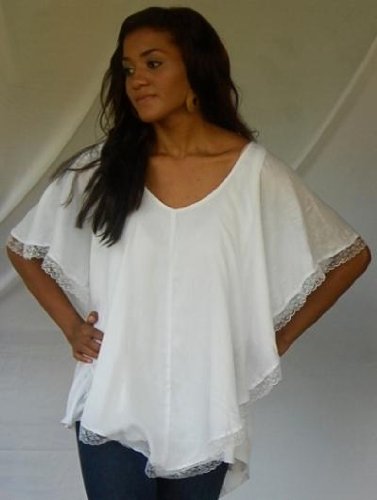 This is a fresh new springtime style you can wear everywhere and with everything. It combines the light and fluttery delicacy of butterfly wings with the feminine mystique of semi-sheer layering and lace; the result is joyous!The v-shaped neckline is self-trimmed, the under-layer is a loose shell and the top layer is designed like a fluttery poncho that falls to a v-shaped hemline front and back. the cut is loose and comfy and it slips on over the head. A delicate lace follows the v-hemline all around.Made up in two layers of a delicate rayon fabric that's light and refreshing for warm weather wear. It has a charming gauzy texture and quality that's especially in vogue right now.Great with jeans, shorts or capris and it looks exceptional with our latest gauchos that feature a scarf at the waist (please see our store.)Fabulously feminine fashion that doesn't skimp on comfort and is loaded with style. You'll enjoy this one time after time ladies.| Brand: | |