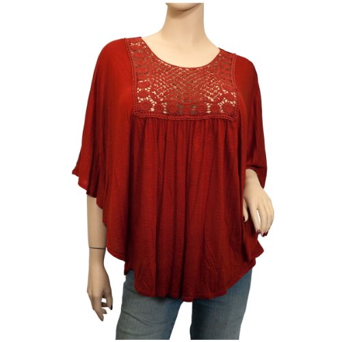 Available in Jr plus size 1XL, 2XL, 3XL. Plus size poncho top features crochet accented front and back. Scoop neck design. Polyester blend. Available in Black, Orange and Brown color choice in our plus size clothing store.| Brand: | |
