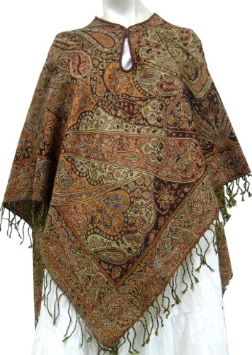 Elegant wool poncho scarf in Jamawar pattern for women in earthy colors with paisley motifs. The design is woven into pure soft wool fabric made by handloom weavers of Kashmir in north India. Beautiful women clothing winter accessory for all occasions, luxurious gift. (Dry Clean Recommended)| Brand: | |